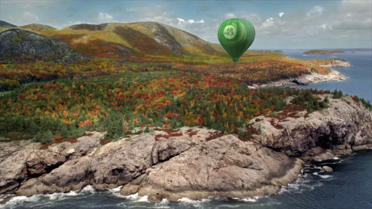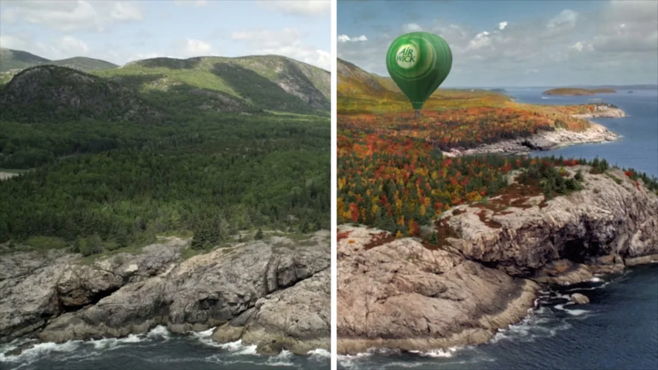 Airwick’s Acadia project had a seasonal issue; it needed be shot during early spring, a time when Acadia is overcast, raining and green. The product line is based on fall foliage so the solution was to find a great creative flame artist/company, with overseas partners to cut and change every leaf, without breaking the bank. Split screen version shows the dramatic change.